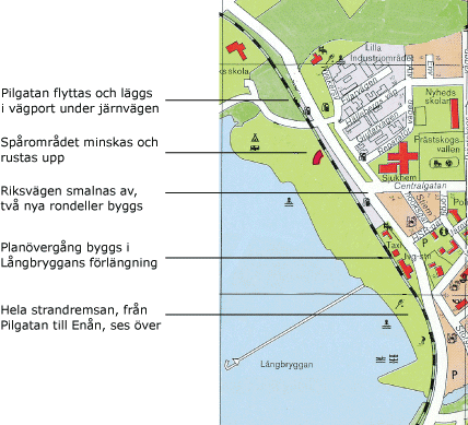 Etapp 3 är den mest omfattande. Den gäller området från järnvägsstationen och norrut förbi Pilgatan, dvs riksvägen efter sträckan, järnvägsområdet och hela Strandremsan mot Siljan.