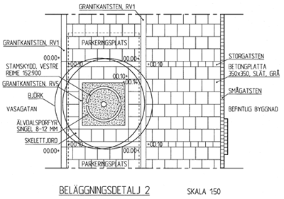 Parkeringsplatsernas material är asfalt med invältat krossmaterial av Älvdalsporfyr och kantsten av granit. På större parkeringsplatser utförs markeringar av ljusa grå betongplattor.