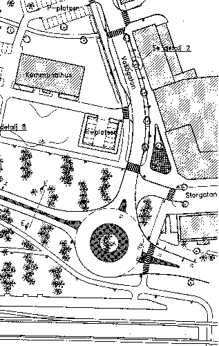 I etapp 1 byggdes den trafikljusreglerade korsningen med Storgatan och Vasagatan om till en rondell. Riksvägen smalnades av och även Vasagatan gjordes smalare. Tallar planterades både i rondellen och vid sidan av vägen.