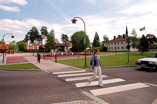 När riksvägen smalnades av och trafikljuskorsningar ersattes med rondeller blev trafiktempot lugnare. Gångstråket i Långbryggans förlängning går upp mot Hemslöjden, förbi fontänen med dansande kullor. I samband med etapp 2 snyggades även miljön kring Kommunalhuset, till höger i bild, upp. Risiga buskar och träd som förut skymde byggnaden har tagits bort, och den ska även fasadbelysas.
